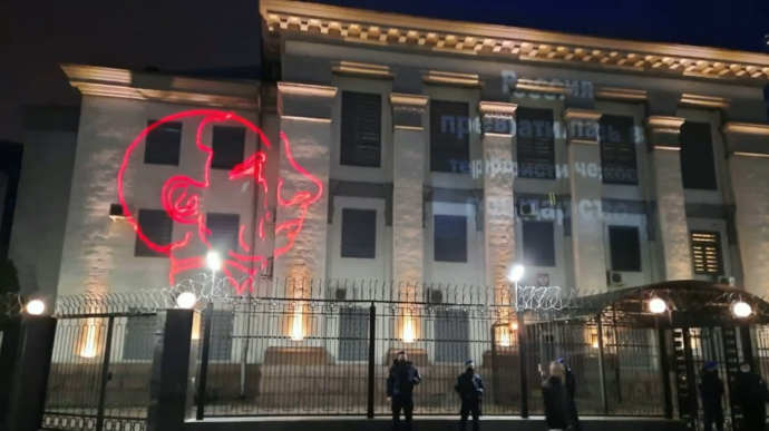 А на стіну посольства учасники акції за допомогою лазерної установки спроектували карикатурний профіль Путіна і напис “Росія перетворилася на терористичну організацію”.