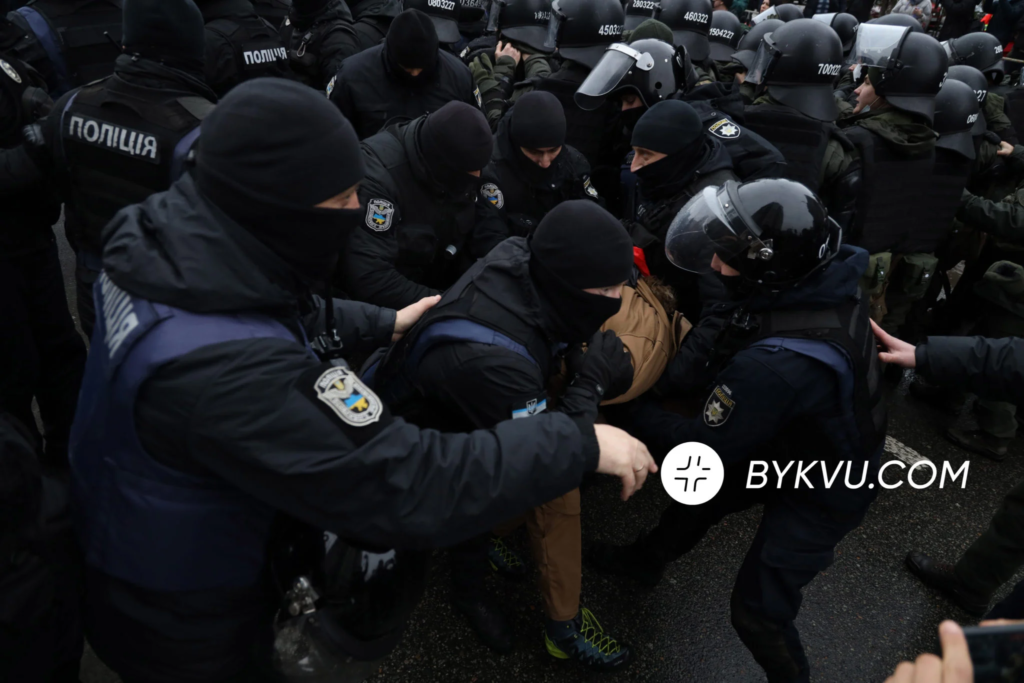 - Під телеканалом НАШ відбулися сутички протестувальників з силовиками. Фото: Букви