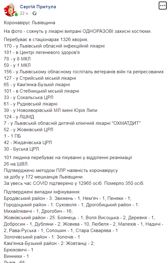 “Коронавірус Львівщина. На фото – сохнуть у лікарні випрані одноразові захисні костюми”,- зазначив у дописі під світлиною з місця події Сергій Притула.
