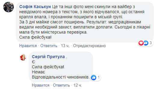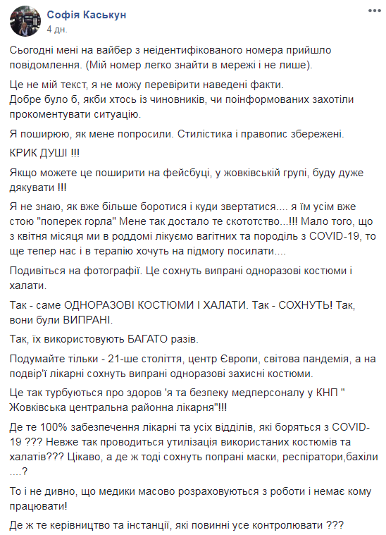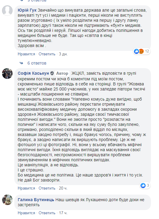 У коментарі до інформації науковець, колишня завідувачка музею «Жовківський замок» Софія Каськун зазначила, що “це та інші фото мені скинули на вайбер з невідомого номера з текстом, з якого відчувалося, що остання крапля впала, і проханням поширити в міській групі. За 3 дні майже сімсот поширень. Результат: медпрацівникам видали необхідний захист, виплатили доплати. Сьогодні в лікарні мала бути міністерська перевірка”.