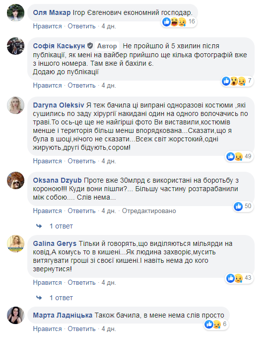Де те 100% забезпечення лікарні та усіх відділів, які боряться з COVID-19 ? Невже так проводиться утилізація використаних костюмів та халатів? Цікаво, а де ж тоді сохнуть попрані маски, респіратори,бахіли ….?