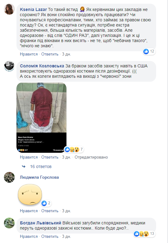 Усі лише звітують скільки гуманітарної допомоги отримали, скільки депутатів чи політичних партій допомогли, а де ж те державне забезпечення, коли з телебачення та офіційних сторінок МОЗ України повідомляють, що виділяється 100% забезпечення на боротьбу з COVID-19, а тим більше, безпека і страхування медиків на першому місці!