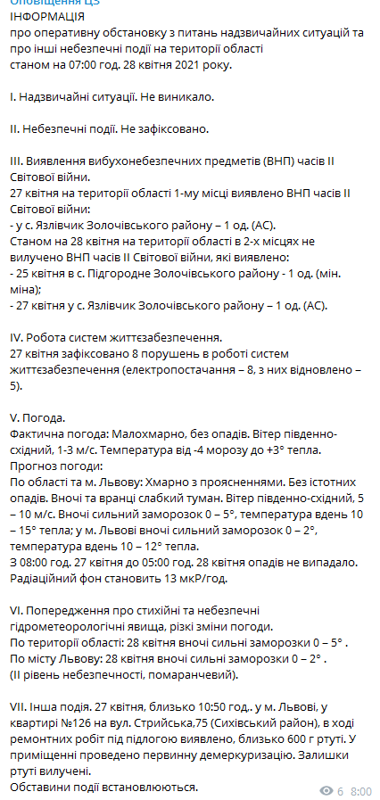 Як зазначається, 27 квітня, близько 10:50 год,. у м. Львові, у квартирі №126 на вул. Стрийська,75 (Сихівський район), в ході ремонтних робіт під підлогою виявлено, близько 600 г ртуті.