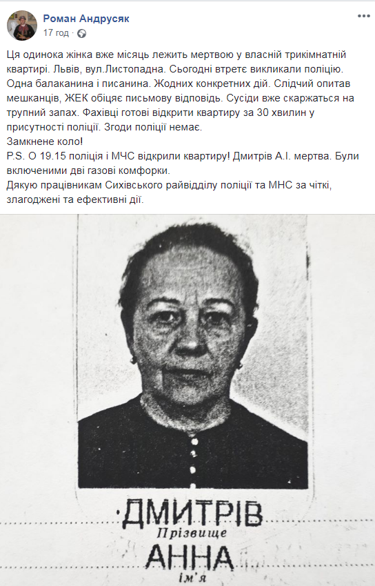 Нагадаємо, ріелтор Роман Андрусяк повідомив, що у Львові в замкненій квартирі вже місяць лежить мертва жінка.