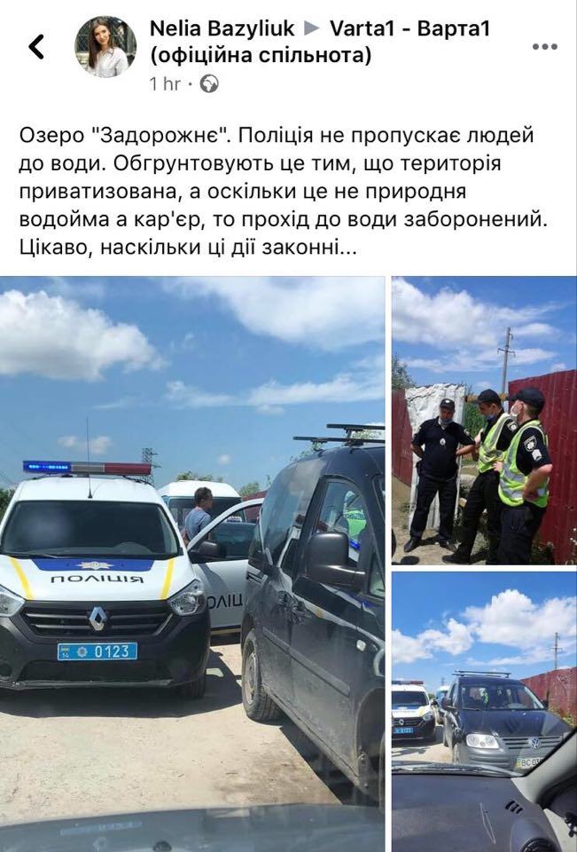 “Озеро “Задорожнє”. Поліція не пропускає людей до води. Обгрунтовують це тим, що територія приватизована, а оскільки це не природня водойма а кар’єр, то прохід до води заборонений. Цікаво, наскільки ці дії законні”, – йдеться у дописі.