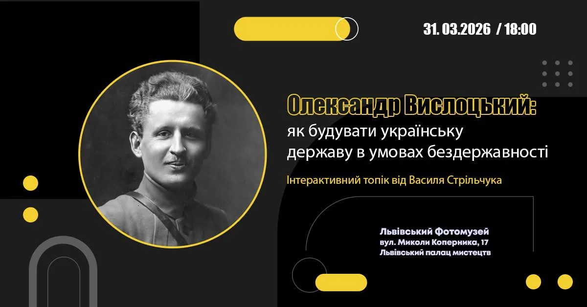 У вівторок, 31 березня, у Львівському фотомузеї відбудеться інтерактивна лекція директора Бродівського історико-краєзнавчого музею Василя Стрільчука «Олександр Вислоцький (1896–1941): як будувати українську державу в умовах бездержавності».