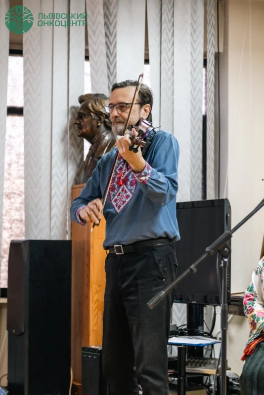 Генеральний директор Львівського онкоцентру Олег Дуда подякував виконавцям та керівництву Львівської національної філармонії імені Мирослава Скорика за неймовірний концерт для усіх працівників онкоцентру.