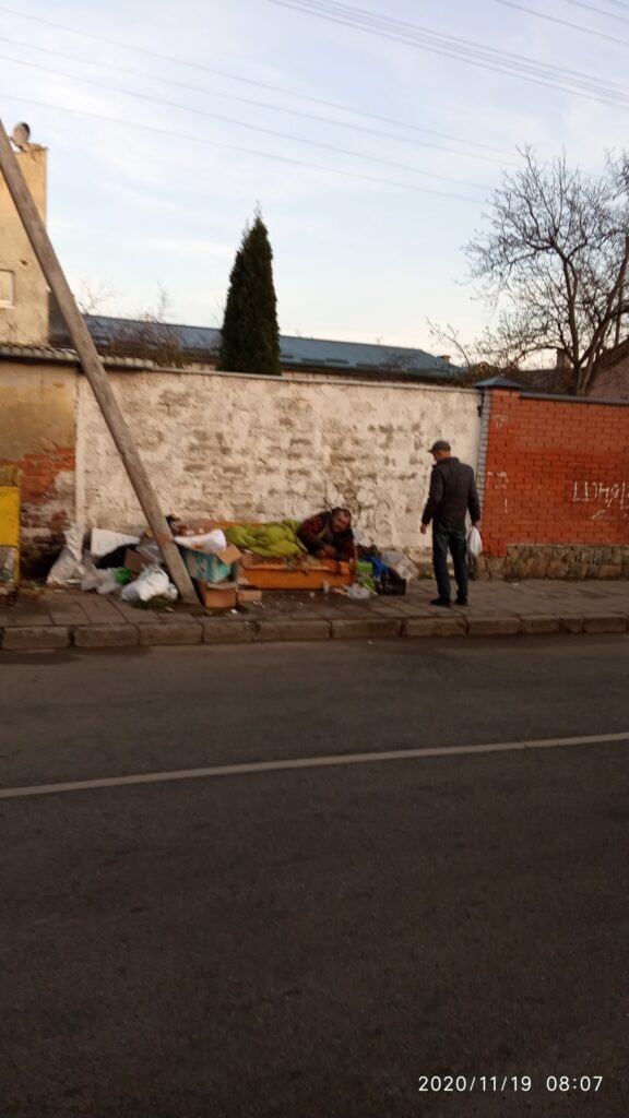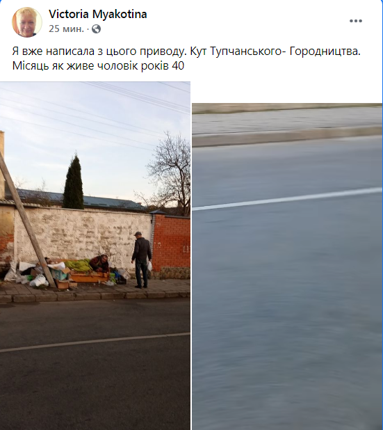 «Я вже написала з цього приводу. Кут Тупчанського-Городництва (Купчинського – Городницька, ?- ред.). Місяць як живе чоловік років 40. Цей чоловік має документи проте чи при ньому вони, не відомо. На моє запитання чому він проживає на вулиці відповів, що так хоче жити. Людина не розуміє наслідків свого проживання взимку на вулиці. Окрім цього, чоловік не в змозі реалізувати свої людські потреби. Його люди підгодовують, співчувають але далі що?», – зазначається у зверненні Victoria Myakotina на «Гарячу лінію міста Львова» у ФБ.