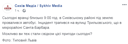 “Сьогодні вранці близько 9:00 год. в Сихівському районі під землю провалився автобус. Інцидент трапився на вулиці Трильовського, що в мікрорайоні Санта-Барбара”, – повідомляє у “Сихів медіа” у ФБ.