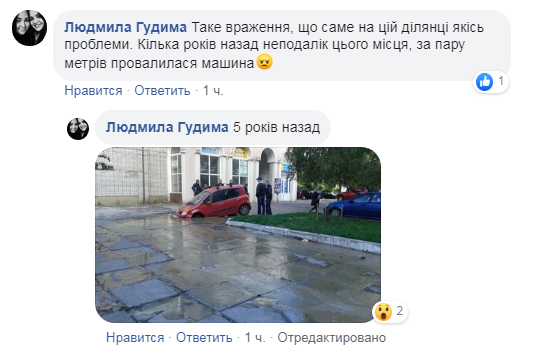 Як зазначається у коментарі до допису, аналогічний випадок мав місце кілька років тому, на цьому ж місці. На вул. Трильовського провалився автомобіль.