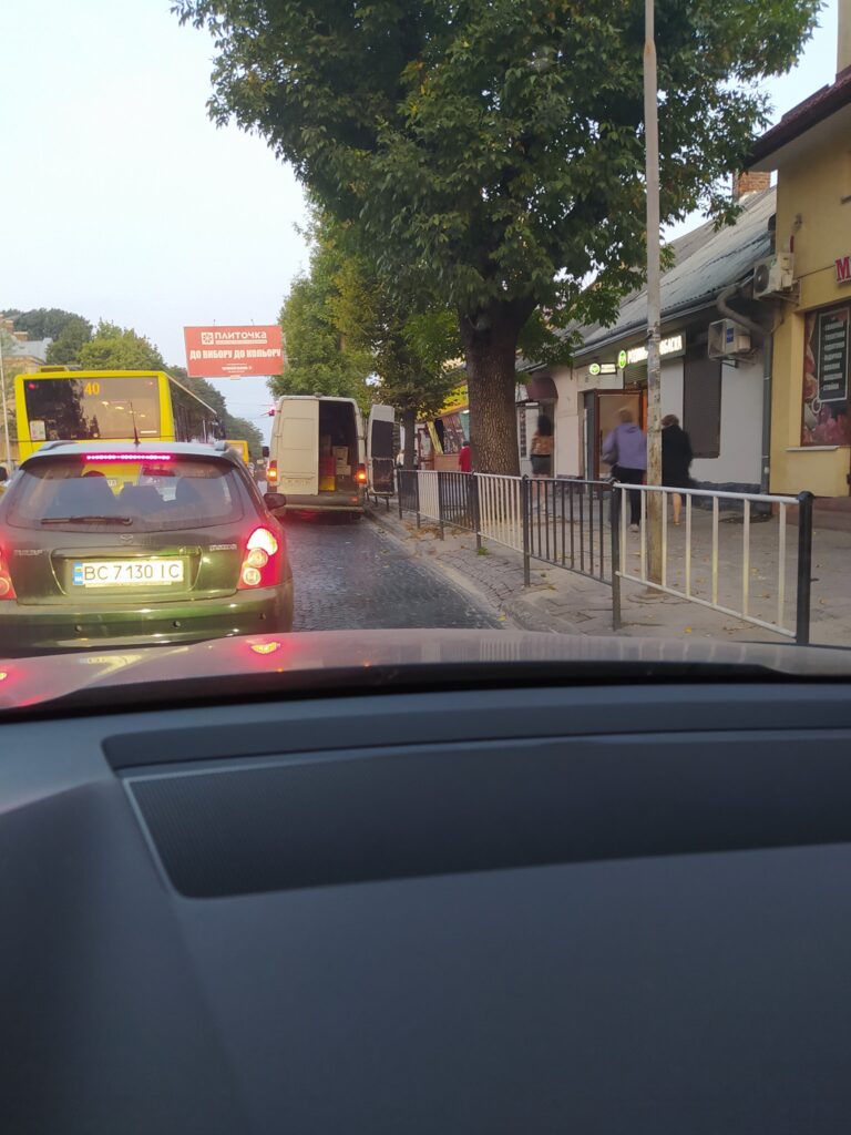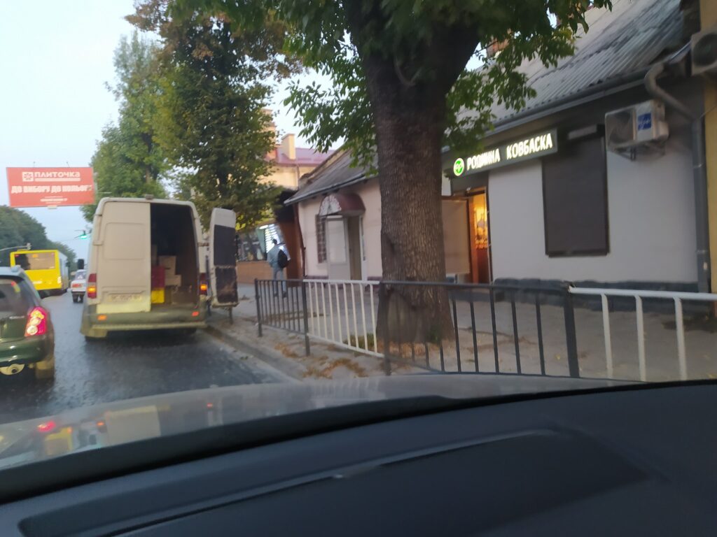 У Львові на вулиці Личаківській, 185, автомобіль, який доставляє продукцію магазину “Родинна ковбаска”, щоранку створює затори.