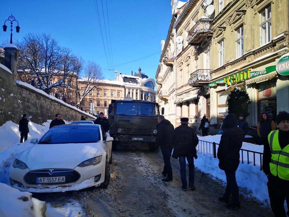 У вівторок, 16 лютого, у Львові на вулиці Грушевського було повністю заблоковано рух через автомобіль марки “Tesla”.