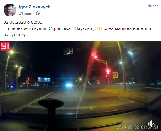 “02.08.2020 о 02:00, на перехресті вулиці Стрийська – Наукова ДТП одна машина вилетіла на зупинку”,- пише Зінкевич.