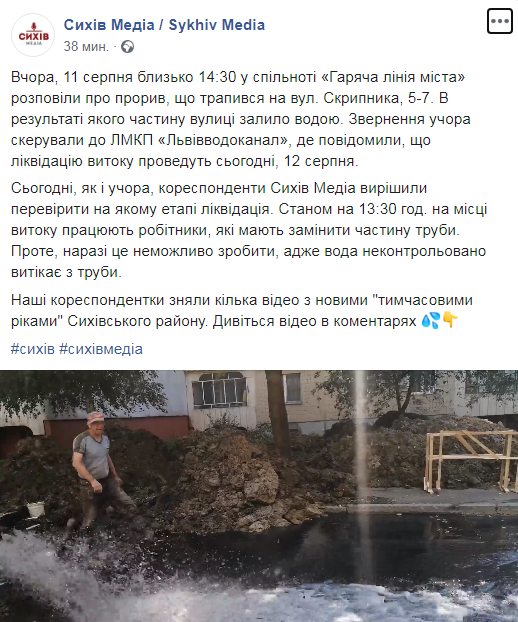 Як повідомляється, “вчора, 11 серпня близько 14:30 у спільноті «Гаряча лінія міста» розповіли про прорив, що трапився на вул. Скрипника, 5-7. В результаті якого частину вулиці залило водою. Звернення учора скерували до ЛМКП «Львівводоканал», де повідомили, що ліквідацію витоку проведуть сьогодні, 12 серпня.