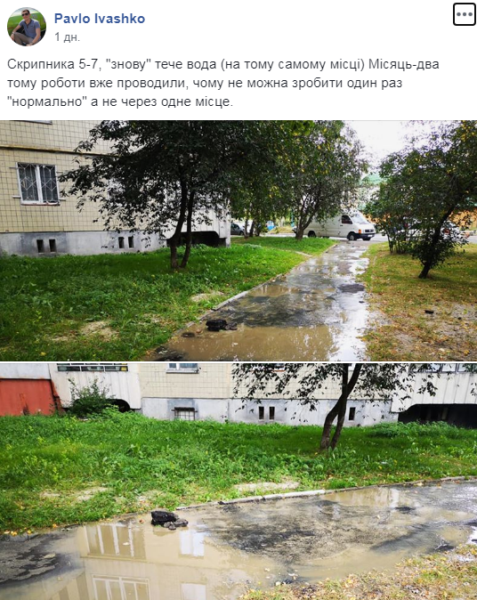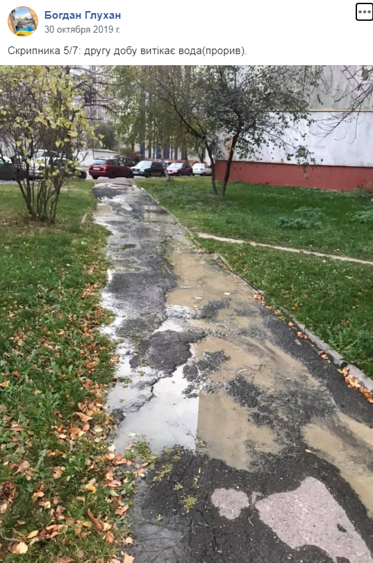 Сьогодні, як і учора, вирішили перевірити на якому етапі ліквідація. Станом на 13:30 год. на місці витоку працюють робітники, які мають замінити частину труби. Проте, наразі це неможливо зробити, адже вода неконтрольовано витікає з труби”.
