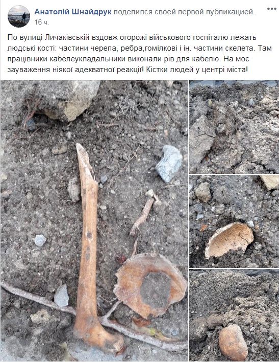 “По вулиці Личаківській, вздовж огорожі військового госпіталю лежать людські кості: частини черепа, ребра, гомілкові і інші частини скелета. Там працівники кабелеукладальники викопали рів для кабелю. На моє зауваження ніякої адекватної реакції! Кістки людей у центрі міста!”,- зазначив у зверненні на “Гарячу лінію міста Львова” у ФБ Анатолій Шнайдрук.