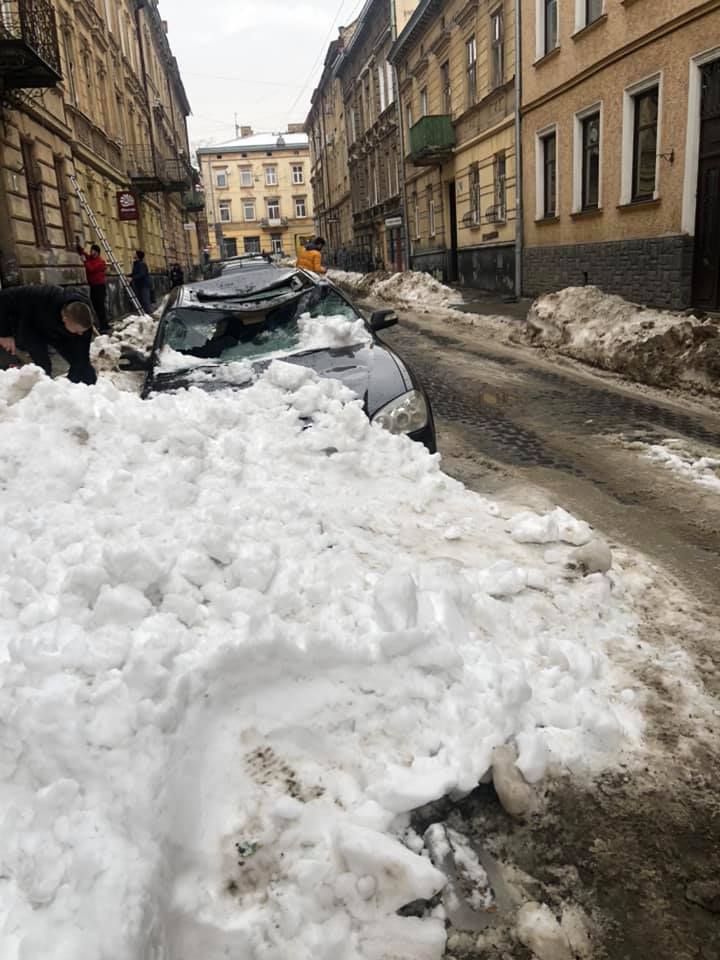 У Львові на вулиці Академіка Філатова з даху будинку на автомобіль впала брила снігу.
