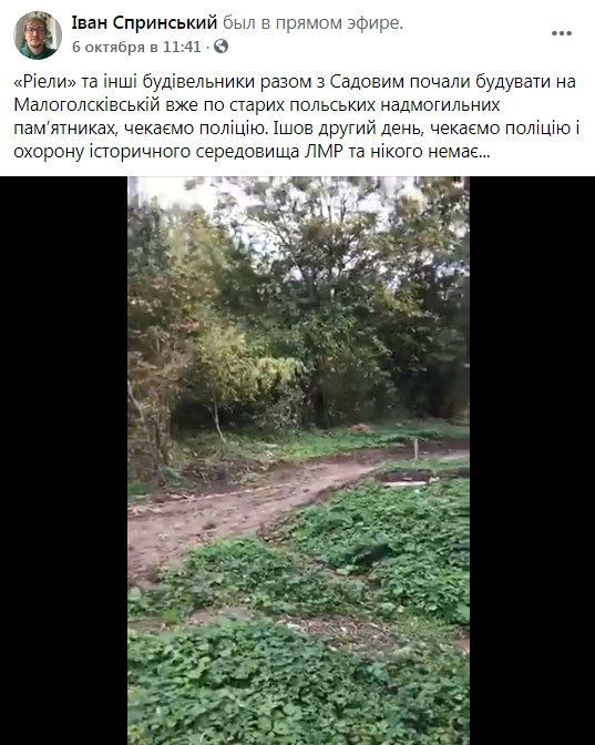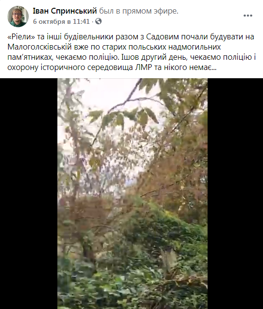 «Ріели» та інші будівельники разом з Садовим почали будувати на Малоголосківській вже по старих польських надмогильних пам’ятниках, чекаємо поліцію. Ішов другий день, чекаємо поліцію і охорону історичного середовища ЛМР та нікого немає…»,- зазначається у дописі Івана Спринського у ФБ.