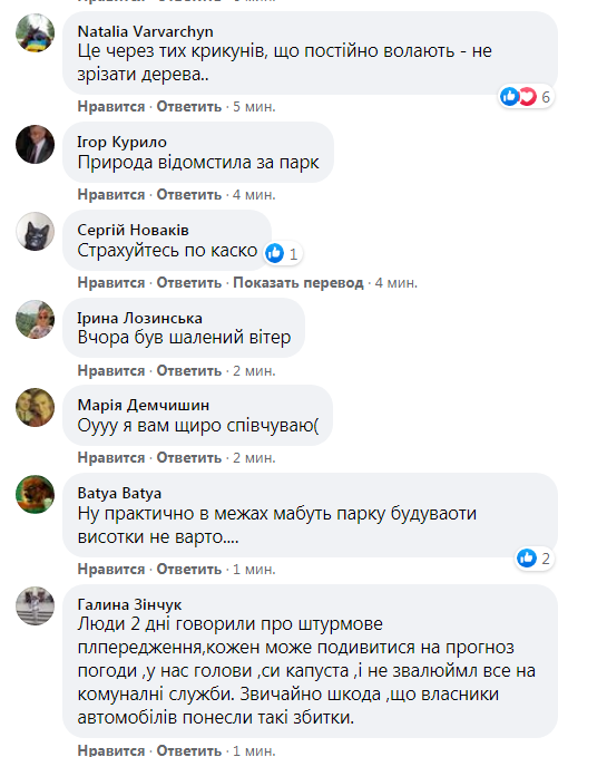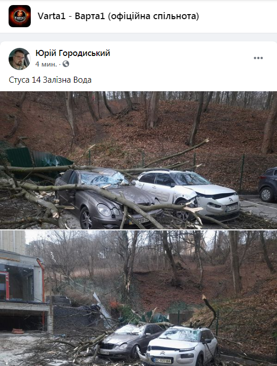 Як повідомляється, на вулиці Стуса, 14 у парку “Залізна Вода” дерева впали на припарковані автомобілі “Mercedes-Benz” та “Citroen”.