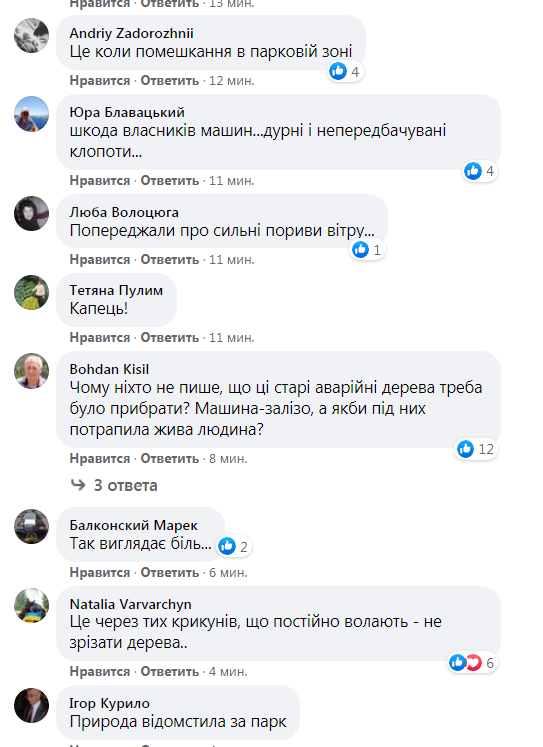 У Львові, внаслідок сильних поривів вітру, на території парку “Залізна Вода” дерева впали на припарковані автомобілі.