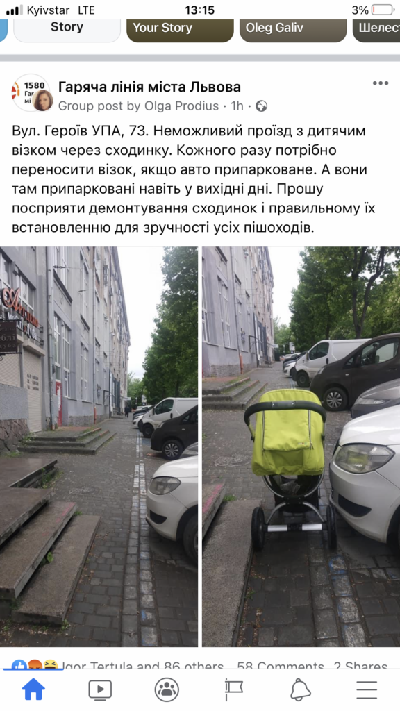 - У Львові через автомобілі та сходи ускладнений проїзд для дитячих колясок, скрін повідомлення