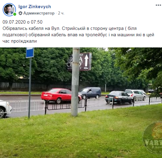 “09.07.2020 о 07:50, обірвались кабелі на вул. Стрийській в сторону центра (біля податкової). Обірваний кабель впав на тролейбус і на машини які в цей час проїжджали”,- повідомив Зінкевич, який оприлюднив світлини та відео з місця події.