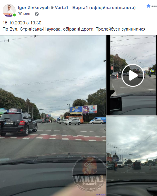 «15.10.2020 о 10:30. По Вул. Стрийська-Наукова, обірвані дроти. Тролейбуси зупинилися», – зазначається у дописі,де також лприлюднено відео та світлини з місця події.