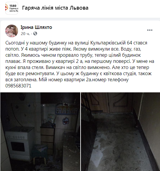 «У будинку на вулиці Кульпарківській, 64 стався потоп. У 4 квартирі живе пияк, якому вимкнули все: воду, газ, світло. Якимось чином прорвало трубу, тепер цілий будинок плаває. Я проживаю у квартирі 2-а, на першому поверсі. У мене на кухні впала стеля. Вимикач на світло вимкнено. Але хто це тепер буде все ремонтувати. У цьому ж будинку є квіткова студія, також вся затоплена»,- зазначається у зверненні на Гарчу лінію міста Львова» Ірини Шляхто, яка оприлюднила світлини з місця події.