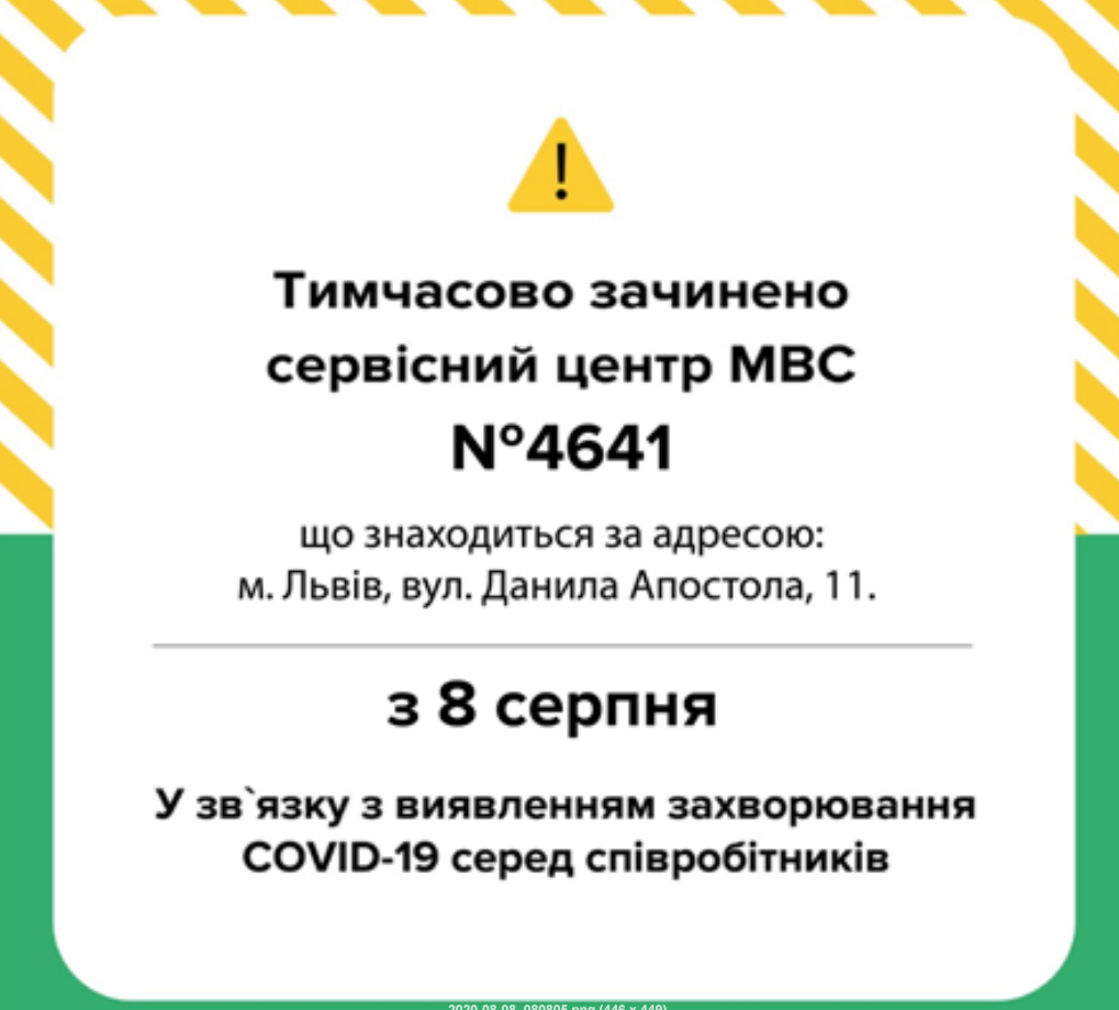 Як зазначається у повідомленні, через виявлення захворювання COVID-19 у співробітників, сервісний центр МВС №4641 у м. Львові (вул. Д.Апостола, 11) з 8 серпня буде тимчасово зачинено.