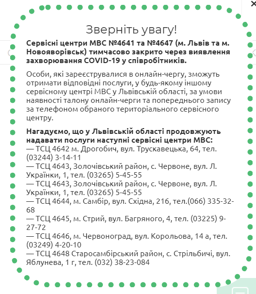 З 8 серпня сервісний центр МВС у Львові тимчасово зачинено. У липні закрили сервісний центр МВС у м. Новояворівськ, через виявлення захворювання COVID-19 у співробітників
