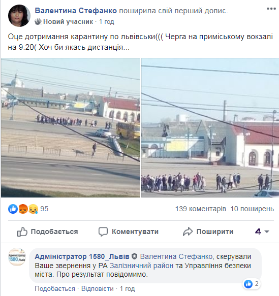 «Оце дотримання карантину по-львівськи. Черга на приміському вокзалі на 9.20. Хоч би якась дистанція…», – зазначається у дописі під світлинами з місця події.
