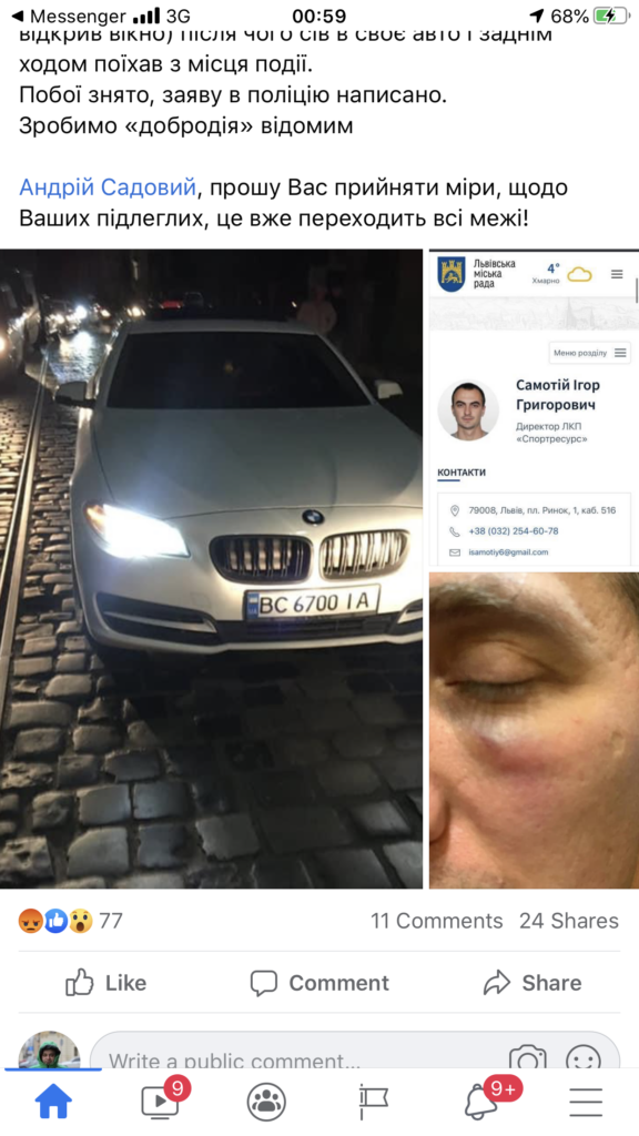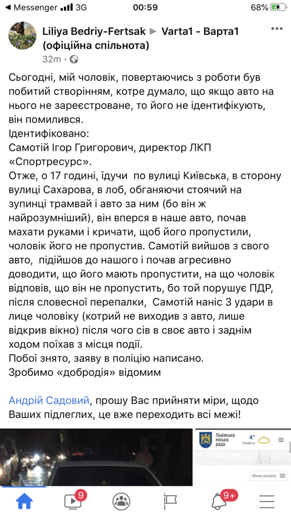 “Сьогодні, мій чоловік, повертаючись з роботи був побитий створінням, котре думало, що якщо авто на нього не зареєстроване, то його не ідентифікують, він помилився “ВС6700ІА”. Ідентифіковано: Самотій Ігор Григорович, директор ЛКП «Спортресурс». Отже, о 17 годині, їдучи по вулиці Київська, в сторону вулиці Сахарова, в лоб, обганяючи стоячий на зупинці трамвай і авто за ним (бо він ж найрозумніший), він вперся в наше авто, почав махати руками і кричати, щоб його пропустили, чоловік його не пропустив. Самотій вийшов з свого авто, підійшов до нашого і почав агресивно доводити, що його мають пропустити, на що чоловік відповів, що він не пропустить, бо той порушує ПДР, після словесної перепалки, Самотій наніс 3 удари в лице чоловіку (котрий не виходив з авто, лише відкрив вікно) після чого сів в своє авто і заднім ходом поїхав з місця події. Побої знято, заяву в поліцію написано”, – написала жінка, додавши фото.