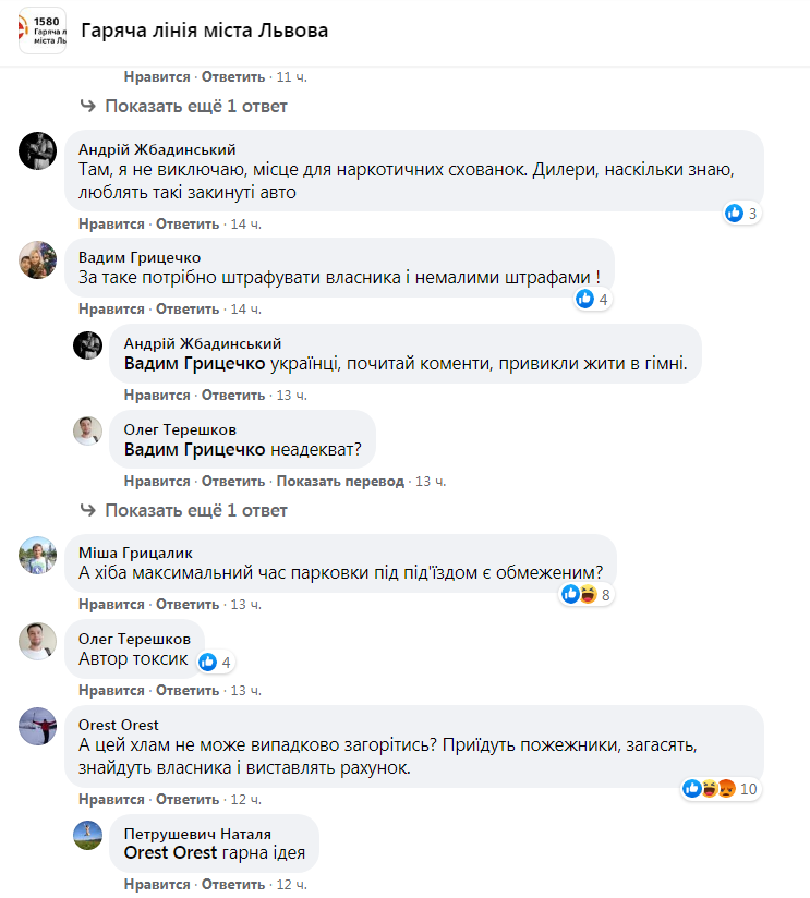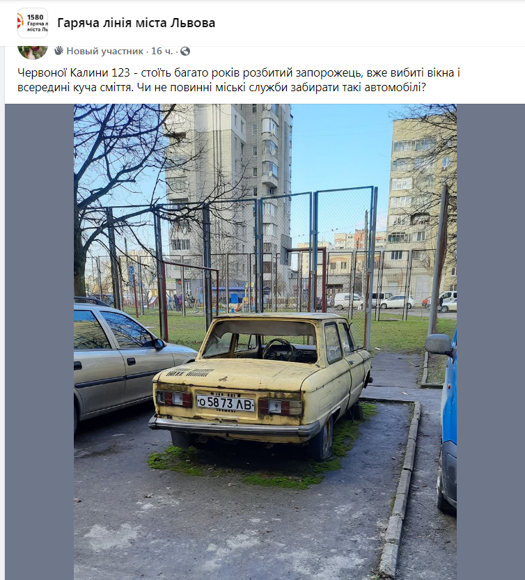 24 січня у зверненні на «Гарячу лінію міста Львова» у ФБ Vasyl Kobylynets написав: «проспект Червоної Калини, 123 – стоїть багато років розбитий «Запорожець», вже вибиті вікна і всередині купа сміття. Чи не повинні міські служби забирати такі автомобілі?»