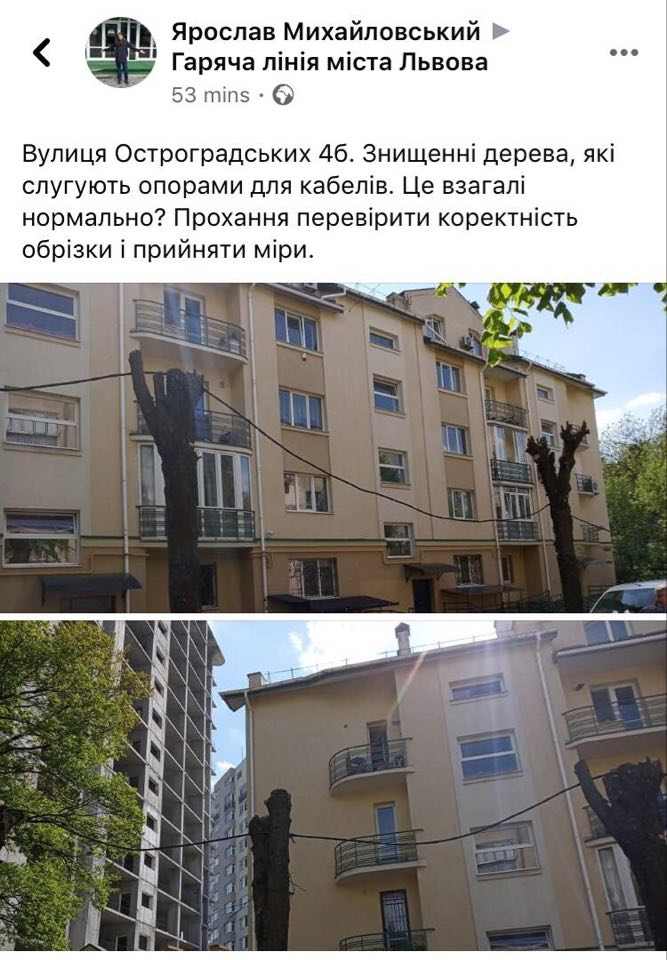 “Вулиця Остроградських 4б. Знищенні дерева, які слугують опорами для кабелів. Це взагалі нормально? Прохання перевірити коректність обрізки і прийняти міри”, – йдеться у дописі.