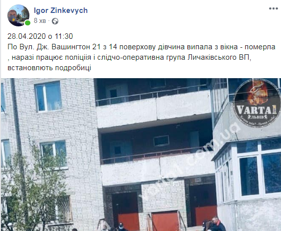 “28.04.2020 о 11:30. По Вул. Дж. Вашингтона, 21, з 14 поверху дівчина випала з вікна, наразі працює поліція і слідчо-оперативна група Личаківського ВП, встановлють подробиці”, – повідомив Зінкевич.