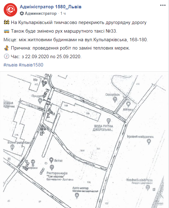“На Кульпарківській тимчасово перекриють другорядну дорогу. Також буде змінено рух маршрутного таксі №33. Місце: між житловими будинками на вул.Кульпарківська, 168-180. Причина: проведення робіт по заміні теплових мереж. Час: з 22.09.2020 по 25.09.2020. “, – зазначається у повідомленні на “Гарячій лінії міста Львова” у ФБ.
