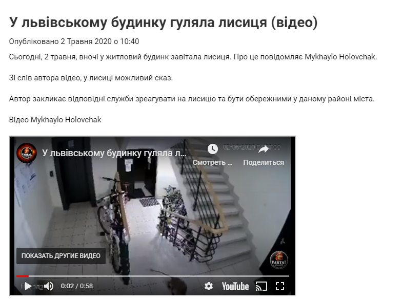 У львівському будинку гуляла лисиця. Сьогодні, 2 травня, вночі у житловий будинк завітала лисиця. Зі слів автора відео, у лисиці можливий сказ.