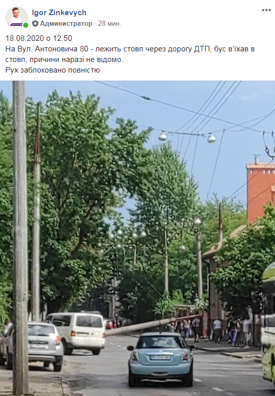 “18.08.2020 о 12:50. На вул. Антоновича, 80 – лежить стовп через дорогу. ДТП, бус в’їхав в стовп, причини наразі не відомо. Рух заблоковано повністю”, – зазначається у коментарі Зінкевича до світлини з місця події.