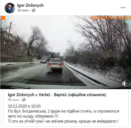 «0.12.2020 о 10:30. По Вул. Богданівська, 2 фури на підйом стоять, а спускаються авто по льоду, обережно! Ті хто на літній гумі і не змінив резину, краще не виїжджати»,- зазначається у коментарі до відео з місця події.