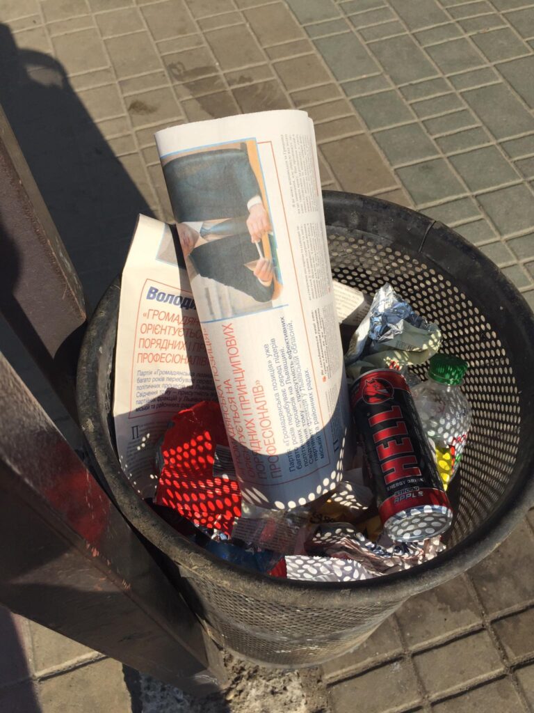 У Львові політичну агітацію потенційного кандидата на голову Львівської ОТГ від партії “Громадянська позиція” Володимира Гірняка викинули у смітник.