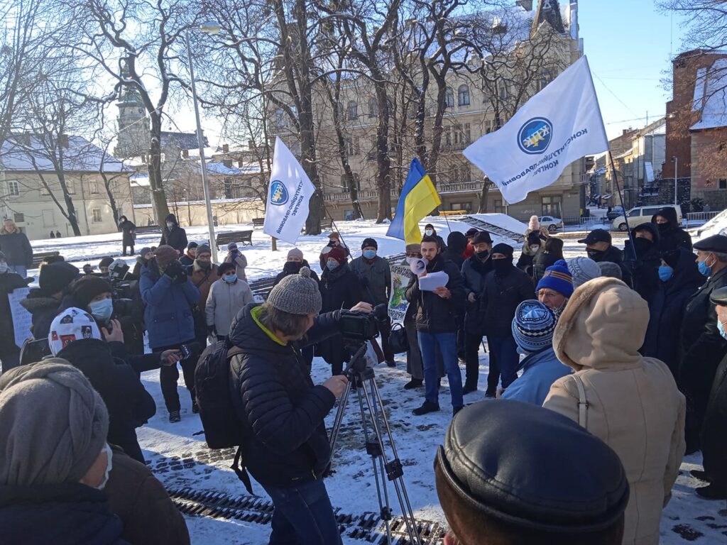 Біля Львівської обласної адміністрації активісти пікетують проти підвищення тарифів.