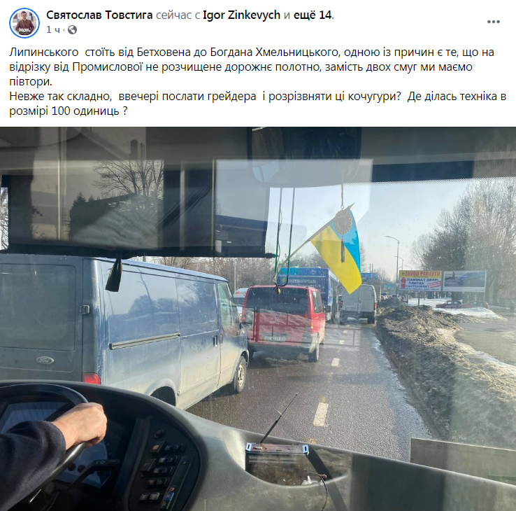 «Липинського стоїть від Бетховена до Богдана Хмельницького, одною із причин є те, що на відрізку від Промислової не розчищене дорожнє полотно, замість двох смуг ми маємо півтори. Невже так складно, ввечері послати грейдера і розрівняти ці кочугури? Де ділась техніка в розмірі 100 одиниць?», – зазначає Святослав Товстига у коментарі до оприлюднених у ФБ світлин з місця події.
