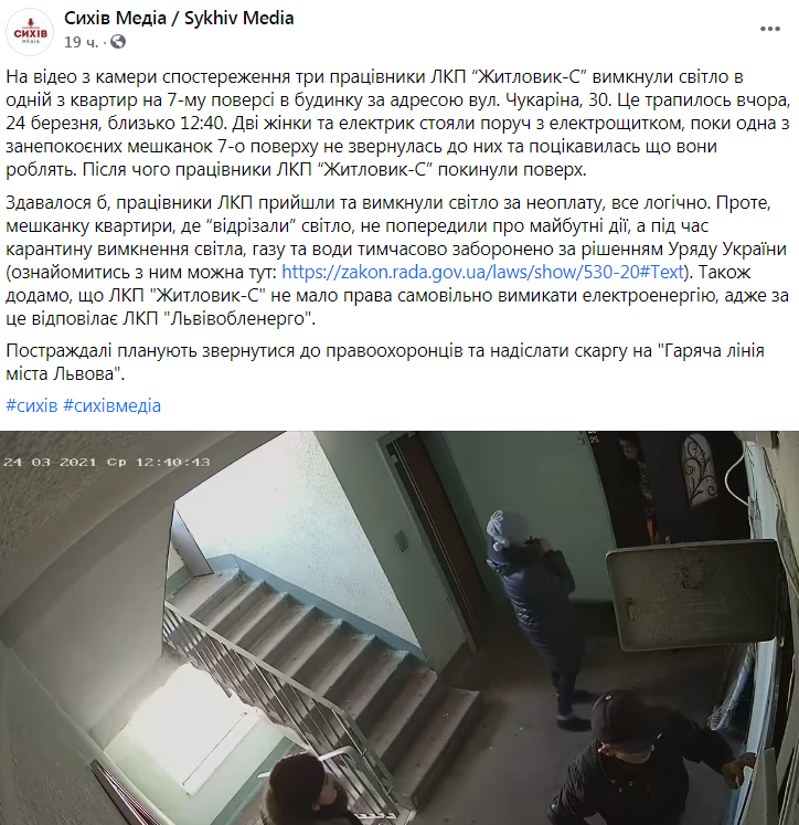 «На відео з камери спостереження три працівники ЛКП “Житловик-С” вимкнули світло в одній з квартир на 7-му поверсі в будинку за адресою вул. Чукаріна, 30. Це трапилось 24 березня, близько 12:40. Дві жінки та електрик стояли поруч з електрощитком, поки одна з занепокоєних мешканок 7-о поверху не звернулась до них та поцікавилась що вони роблять. Після чого працівники ЛКП “Житловик-С” покинули поверх.