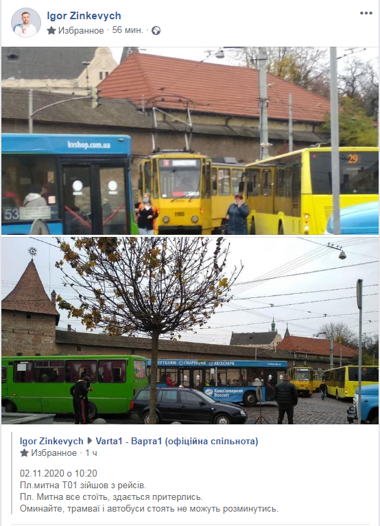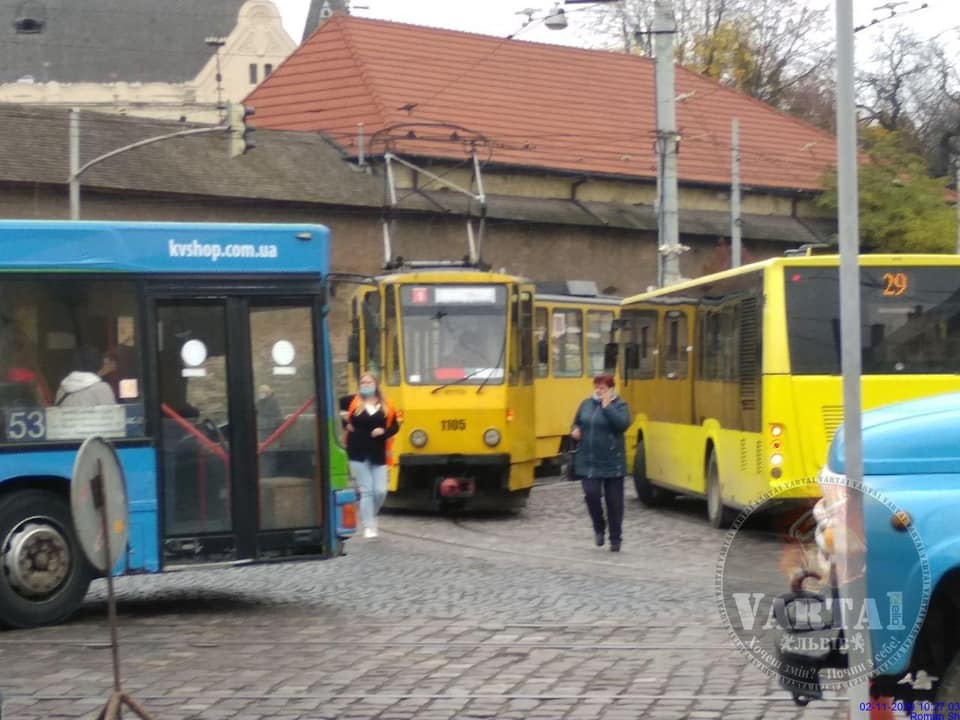 “02.11.2020 о 10:20. Площа Митна. Трамвай №1 зійшов з рейсів. Площа Митна все стоїть, здається притерлись. Оминайте, трамваї і автобуси стоять, не можуть розминутись”,- повідомляє “Варта 12 у ФБ, де оприлюднено світлини з місця події.