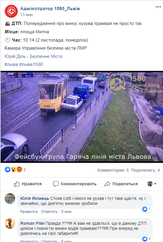 «ДТП: Попередження про винос кузова трамвая не просто так. Місце: площа Митна. Час: 10:14 (2 листопада, понеділок). Камера Управління безпеки міста ЛМР», – зазначається у повідомленні адміністратора «Гарячої лінії міста Львова» у ФБ.