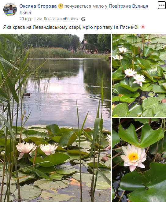 «Яка краса на Левандівському озері, мрію про таку і в Рясне-2», – зазначила автор світлин Оксана Єгорова.