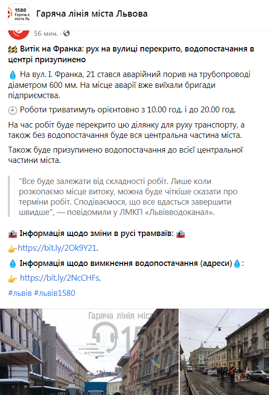 Позначки: витік, вода, вулиця І.Франка, рух, трамваї, транспорт