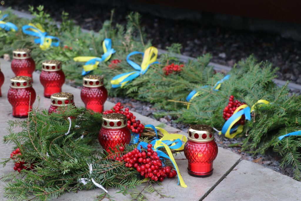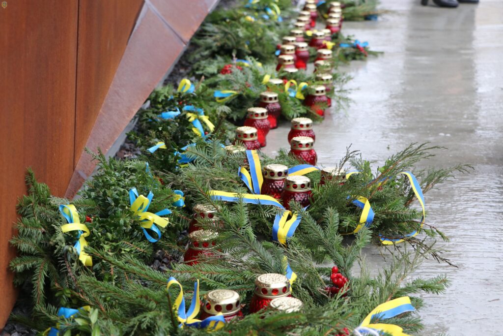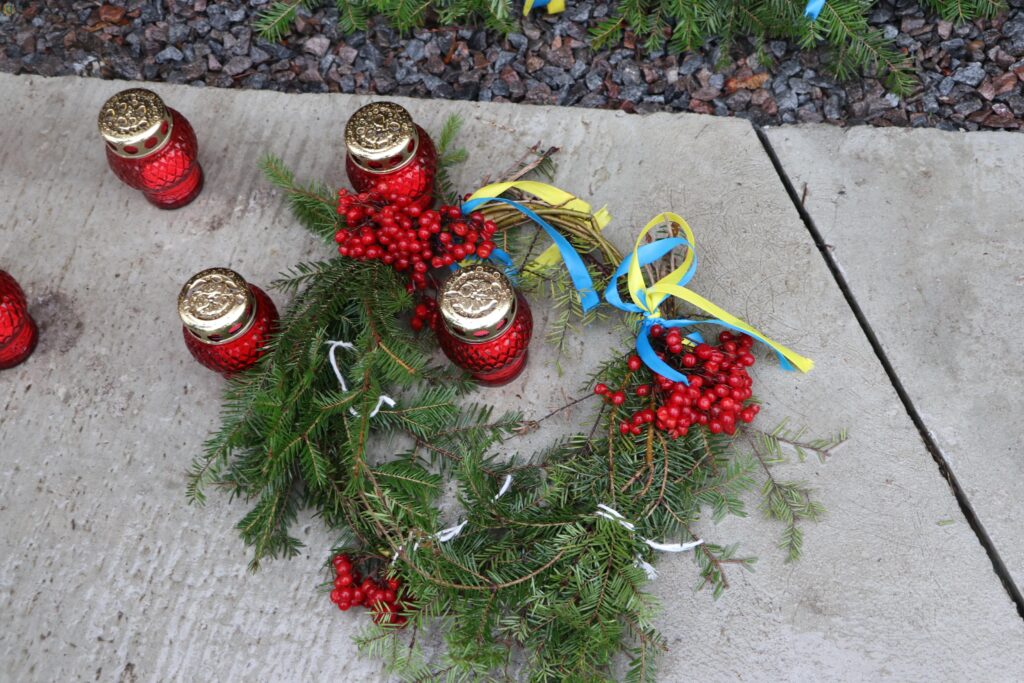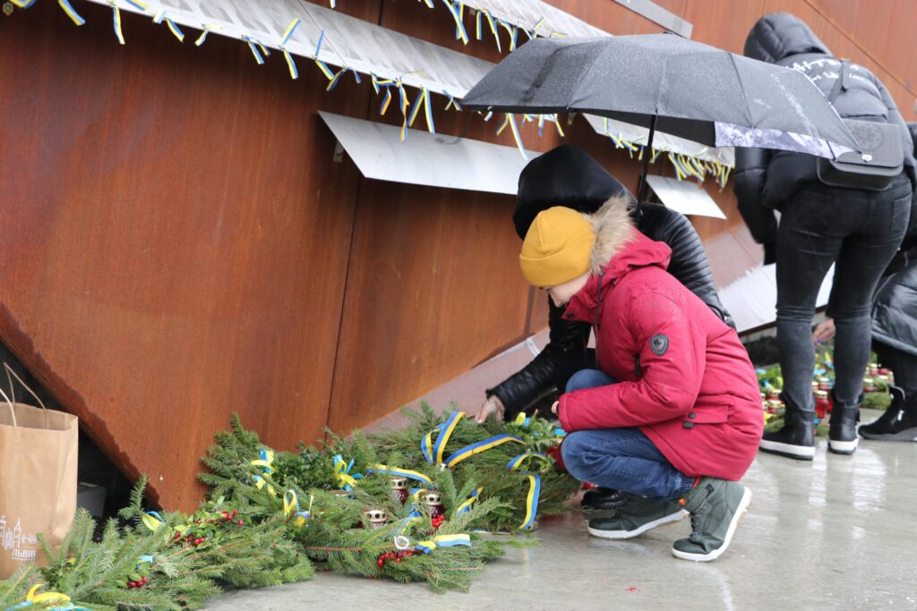 Пам’ятний знак оздобили вінками із ялинкових гілок та калини, які родини Героїв зробили власноруч. Львівські пластуни принесли до Меморіалу Вифлеємський Вогонь Миру та запалили лампадки.