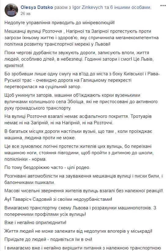 Як написала на сторінці ГО “Варта 1” у ФБ Олеся Дацко, “Недолуге управління приводить до мініреволюцій! Мешканці вулиці Розточчя , Нагірної та Загірної протестують проти загрози їхньому життю і здоров’ю, яку спричинила меганекомпетентна політика розвитку транспортної мережі у Львові!