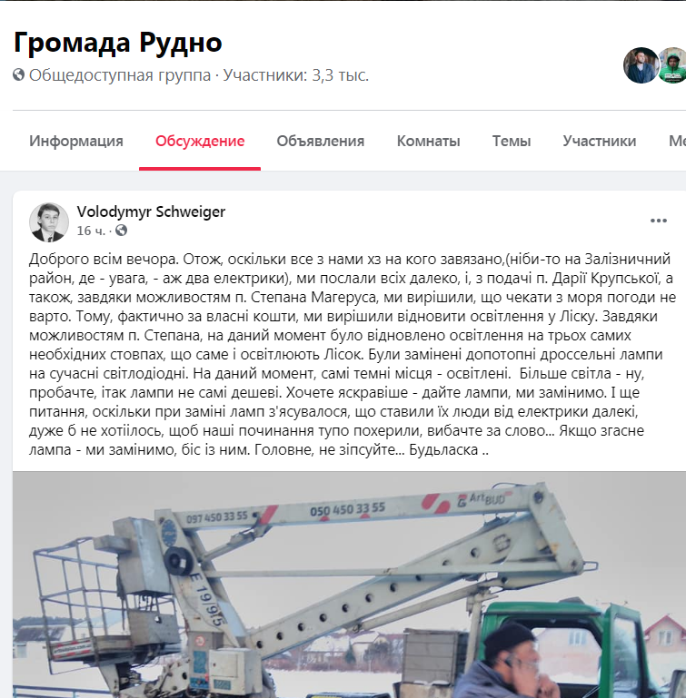 «Оскільки все з нами хз на кого зав’язано, (ніби-то на Залізничний район, де – увага, – аж два електрики), ми послали всіх далеко, і вирішили, що чекати з моря погоди не варто. Тому, фактично за власні кошти, ми вирішили відновити освітлення у Ліску. На даний момент було відновлено освітлення на трьох самих необхідних стовпах, що саме і освітлюють Лісок. Були замінені допотопні дросельні лампи на сучасні світлодіодні. На даний момент, самі темні місця – освітлені. Більше світла – ну, пробачте, і так лампи не самі дешеві. Хочете яскравіше – дайте лампи, ми замінимо»,- зазначає у дописі Volodymyr Schweiger на сторінці спільноти «Громада Рудно» у ФБ.